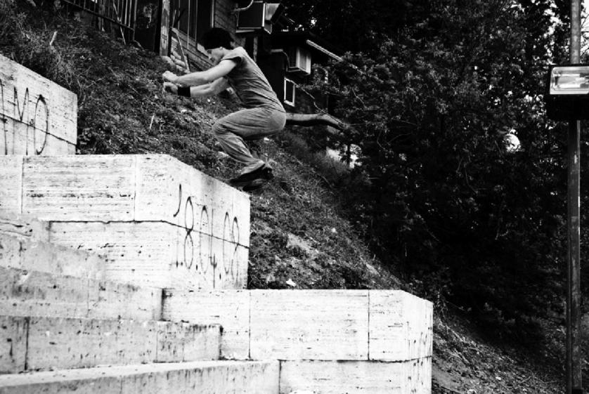 «Per gioco, che verso i 18 anni si è fatto serio. Eravamo un decina di ragazzi, abbia-mo cominciato a cercare risposte sulla vita e metodi tecnici per il nostro allenamento: leggevamo libri, cercavamo consigli di sportivi per gli esercizi. La ribellione, la disarmonia con l’esistenza che avevamo attorno e la disillusione trovavano nel par-kour un modo di esprimersi. L’allenamento ci dava la sensazione di essere liberi, la rabbia si sfogava. Ognuno di noi aveva una sua ricerca personale da portare avanti e ognuno di noi poi ha preso la sua strada…».