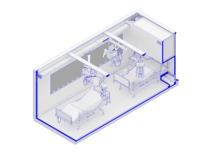 Ogni container è riconverito per creare una stanza di biocontenimento, lunga circa 6 metri, con due posti letto attrezzati per la terapia intensiva, pressione negativa e una pompa che purifica l’aria. In questo modo medici e infermieri non rischiano il contagio. Il containter funziona in autonomia e può essere spedito ovunque. Combinando più unità, collegate da un corridoio gonfiabile, si possono ottenere configurazioni multiple a moduli (da 4 a oltre 40 posti letto), che potrebbero essere posizionate vicino agli ospedali o in altri spazi liberi in città.