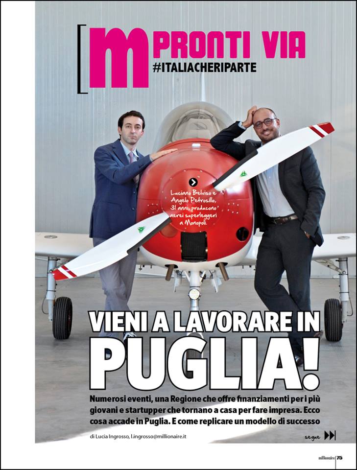 «E’ un ottimo posto per fare business, oltre che per vivere. E’ una regione che ha alzato la testa. Nel 2008 abbiamo ricevuto 25mila euro da Principi Attivi. Per cominciare andava bene, poi dovevamo crescere. Oltre 40 banche ci hanno detto che il nostro progetto era troppo rischioso. A 5 giorni dalla scadenza. ci siamo giocati il tutto per tutto. Con la forza della disperazione e la faccia tosta, abbiamo fermato il nostro concittadino, Vito Pertosa e gli abbiamo detto: “Vogliamo fare aeroplani”. Il cavaliere Pertosa è a capo di una holding che opera nel settore ferroviario (MerMec) e spaziale (Siatel) e che investe nelle nuove idee».