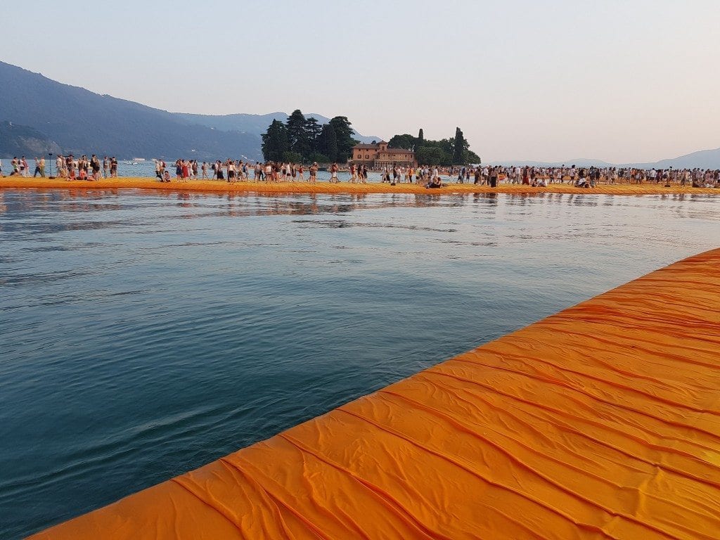 Ebbene sì, eravamo lì, sul lago di Iseo venerdì pomeriggio, a poche ore dalla chiusura della mitica passerella galleggiante The Floating Piers. Sì, mitica, non pensavamo prima di salirci. Innanzitutto, il pontile (formato da galleggianti ancorati tra di loro da grandi perni di forma cilindrica, a loro volta ancorati, attraverso dei cavi, a 200 pesi in cemento da 5,5 tonnellate ciascuno), era incredibilmente stabile. Ti sentivi fluttuare ma non più di tanto. Bellissimo percorrerlo a piedi scalzi. Poi il suo colore, un giallo arancione che cambiava a seconda dei momenti della giornata e della luce, insieme al variare del colore dell’acqua. Camminando sulla passerella, ci siamo resi conto come nulla fosse casuale. La passerella univa il paese di Sulzano all’isola di fronte, poi a un’altra isoletta più piccola, quella di San Paolo (di proprietà della famiglia Beretta), formando linee ben precise, armoniose, perfette. Ci sentivamo dentro un’opera d’arte: camminavamo in un posto fuori dal tempo e dallo spazio, ammirando le montagne di fronte, sentendoci parte della natura.